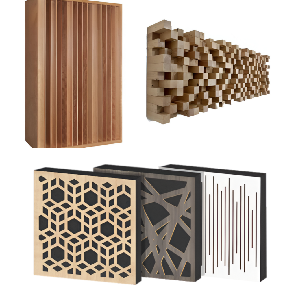 - Wood: Commonly used for its ability to evenly diffuse sound waves.